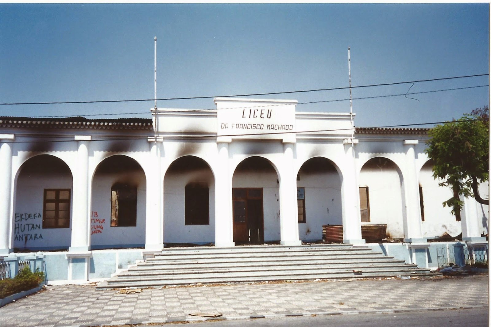 caminho ficam os destroços do Liceu Dr. Francisco Machado, com a fachada